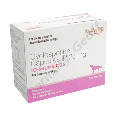 Ichmune C (Cyclosporine) used to treat atopic dermatitis or perianal fistulae (inflammation, ulceration and draining sinuses around the anus) in dogs. Cyclosporine is classed as an immunosuppressant. By supressing certain cells in the immune system (T-helper and T-suppressor cells) and inhibiting interleukin-2 it is able to reduce the symptoms associated with these conditions.